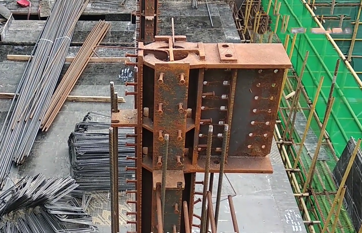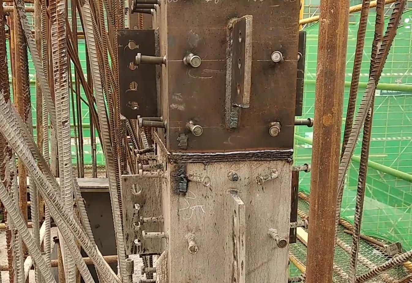 所有劲性钢柱在出厂前要按照图纸要求打好栓钉。劲性柱上的栓钉可以起到增加混凝土的摩擦力和握裹力。现场禁止在劲性钢柱上用气割开孔,但是可以焊接用于连接的梁钢筋。钢筋的弯梁的位置,有三种连接方式,第一种就是我们钢筋套筒连接器,包括柱子位置与牛腿上下连接;第二个方法就是连接焊接钢筋,跟着牛腿直接焊接在上面,第三种就是钢梁两边连接高强螺栓把连接板连接在一起。